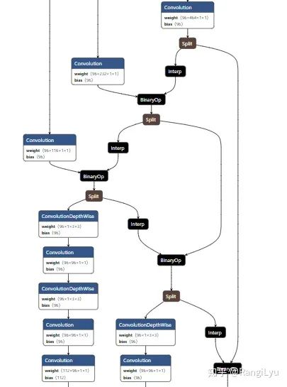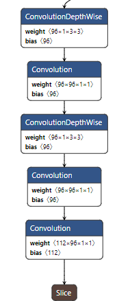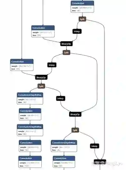 FCOS的检测头使用了4个256通道的卷积作为一个分支,也就是说在边框回归和分类两个分支上一共有8个c=256的卷积,计算量非常大。为了将其轻量化,我首先选择使用深度可分离卷积替换普通卷积,并且将卷积堆叠的数量从4个减少为2组。在通道数上,将256维压缩至96维,之所以选择96,是因为需要将通道数保持为8或16的倍数,这样能够享受到大部分推理框架的并行加速。最后,借鉴了yolo系列的做法,将边框回归和分类使用同一组卷积进行计算,然后split成两份。下图就是最终得到的轻量化检测头的结构,非常的小巧: