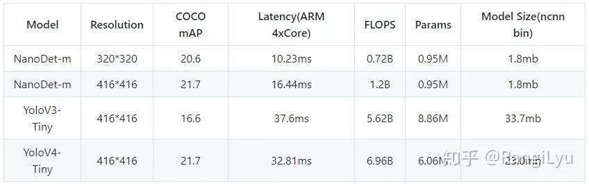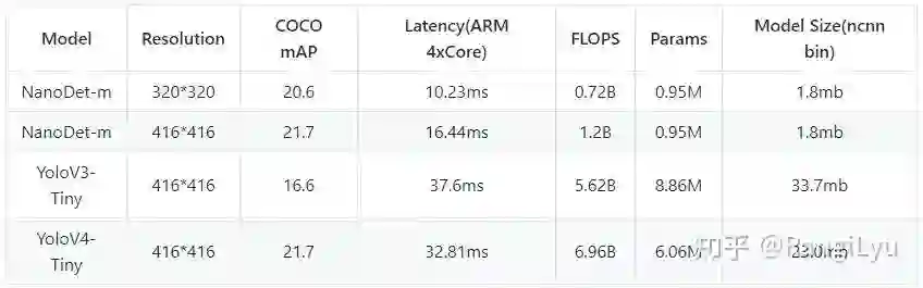 华为P30上用NCNN移植跑benchmark,每帧仅需10.23毫秒,比yolov4-tiny快3倍,参数量小6倍,COCO mAP(0.5:0.95)能够达到20.6 。而且模型权重文件只有1.8mb,对比动辄数十兆的模型,可以说是相当友好了~