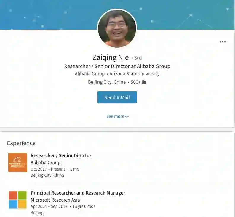 从他们的领英账户看来,二人履历均很简单。其中聂再清从清华大学本科及硕士毕业后,于 1999 年来到亚利桑那州立大学读博士,后于 2004 年博士毕业后加入微软亚洲研究院工作至今。近日,已近不惑之年的他在领英主页新增就职阿里的信息,职位为研究员、高级总监。