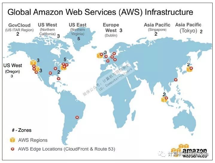 在云的虚拟化环境中,一般情况用VPC隔离。但对于GovCloud这种保密要求极高的系统也采用了物理隔离。物理隔离虽然有点跟云计算一切资源皆可共享的理念有点不搭调,但在安全上却是真实的需求。AWS全球节点如图4所示。