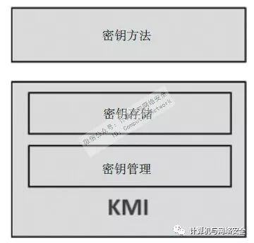 如图8所示,密钥管理基础设施(KMI)通常分两部分:密钥的存储,对密钥本身的访问授权管理。更上层的加密方法通常由应用自身去实现。