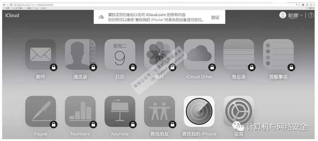 首先账户要启用2FA,当启用2FA后,即使攻击者取得了账户的口令直接登录iCloud,也会看到如下界面,邮件、通讯录、照片等均显示为上锁不可访问的状态,如图10所示。