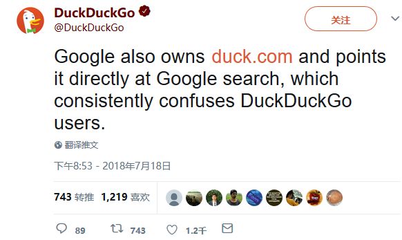 此外,Google 还拥有 http://duck.com 域名并将其指向 Google 搜索,让 DuckDuckGo 用户感到困惑。