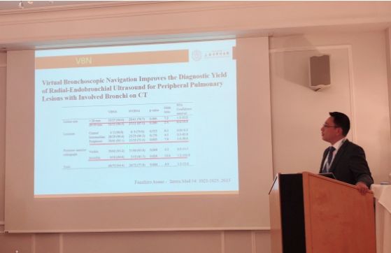 顾烨教授首先介绍细支气管镜,肺外周超声,虚拟支气管镜,经支气管旁路导航,电磁导航等技术对早期肺癌诊断与治疗中应用现状与展望。更对最新的机器人支气管镜进行了介绍,取得了不错的反响。发言后由中外专家提问交流,其中德国专家提到利用电磁导航对肺外周结节术定位的方法,我院对此有一定经验,进行了深度探讨,同时加深了中德之间在介入呼吸病学中的交流学习。