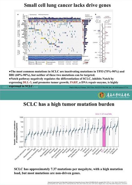 小细胞肺癌的相关驱动基因:在SCLC中最常见的突变是TP53和RB1的突变,但这两种突变都不能成为治疗靶点;Notch通路可以负向调控SCLC的分化,通过表达DLL-3可以抑制Notch通路从而促进肿瘤的生长;PARP是一种DNA修复酶,在SCLC中高度表达。一项替莫唑胺联合PARP 抑制剂Veliparib治疗复发敏感或难治性小细胞肺癌的随机双盲研究中,Veliparib并不能改善四个月的PFS和中位OS,但可以显著改善ORR。其中,SLFN11表达与接受TMZ / veliparib患者的PFS和OS改善相关,提示SLFN11有希望成为SCLC中PARP抑制剂敏感性生物标志物;SCLC存在高突变负荷(7.37mut/MB),但绝大多数突变都非驱动基因。