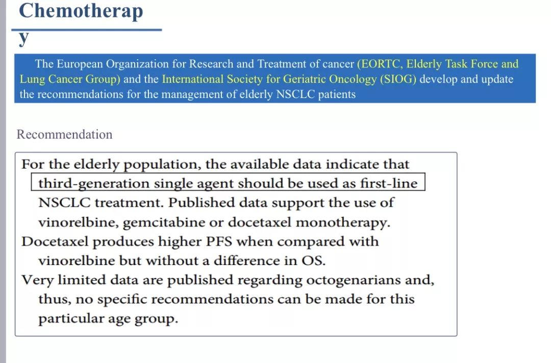 在抗血管治疗方面:根据目前的观察结果,缺乏强有力的证据推荐老年晚期NSCLC患者使用血管生成抑制剂。