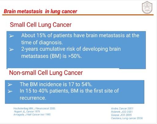 恶性肿瘤脑转移明显影响了患者的生存和生活质量。也是肺癌患者主要的治疗失败原因。据文献报道,在小细胞肺癌的疾病过成中,约50%的患者会发生脑转移;而约17-34%的非小细胞肺癌患者在初次诊断时发现脑转移。所以预防脑转移的发生可显著提高肺癌患者的预后。
