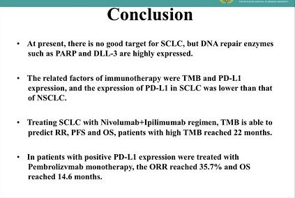 小细胞肺癌免疫治疗的相关因素为TMB和PD-L1表达,在SCLC中TMB较高,但PD-L1的表达比NSCLC的表达要低。Checkmate032的研究结果提示:用Nivolumab和Ipilimumab治疗SCLC,TMB可以成为临床获益的预测因子,高TMB组的总生存期达到22个月。Keynote158研究中Pembrolizumab治疗进展后的SCLC患者,PD-L1阳性的病人客观缓解率达到35.7%,总生存期达到14.6个月。