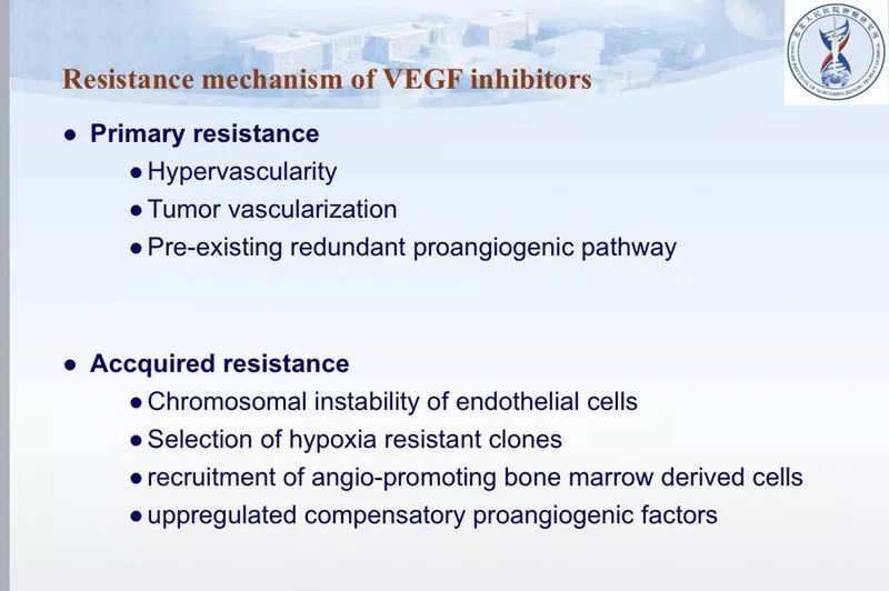 (1)原发性耐药机制:血管生成过多;肿瘤血管化;已存在有其他的促血管生成的通路。