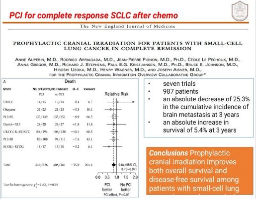许教授分别跟大家介绍了化疗后疾病缓解局限期小细胞肺癌脑预防性放疗的作用;完全切除术后小细胞肺癌脑预防性放疗的作用;化疗后疾病缓解广泛期小细胞肺癌脑预防性放疗的作用。同时还分析了脑预防性放疗后的患者发生脑转移再程行脑部放疗的疗效及毒副反应。对非小细胞肺癌脑预防性放疗的作用也进行了阐述,局部晚期患者若治疗后疾病无进展,脑部预防性放疗可降低脑转移的发生,但对患者总生存无显著性影响,需要行进一步的随机临床试验明确其作用。