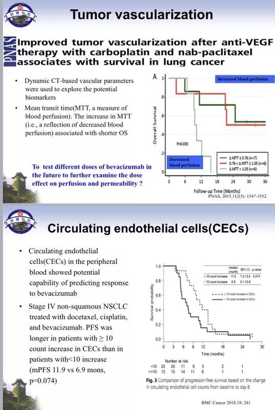 (2)与免疫治疗联合。IMPOWER150的研究结果提示Atezolizumab联合贝伐单抗和化疗组较贝伐单抗联合化疗组显著延长了患者PFS,特别是在驱动基因阳性(EGFR/ALK+)以及肝转移患者中也看到了显著良好获益。在抗血管生成治疗生物标志物方面的探索从未停止。近期有研究提示,CT上的血管影像参数、平均通过时间(Mean transit time,MTT)、循环内皮细胞(Circulating endothelial cells, CECs)等有可能成为抗血管治疗在肺癌中应用的潜在标志物,然而这些发现仍需要在大样本临床研究中进一步验证。尽管目前并没有成熟的可以在临床应用的抗血管生成治疗疗效预测分子生物标志,但是探索有效的生物标志物仍然是进一步提高抗血管治疗疗效的关键所在。