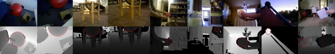 图7. 野外球体检测的定性可视化:我们的算法在杂波、遮挡、大距离等困难场景中非常成功。请注意,球体在3D中仅使用深度图像的点云进行探测,我们绘制了二次曲面的表观轮廓。RGB图片也包括在顶部的一行,以减轻视觉感知。