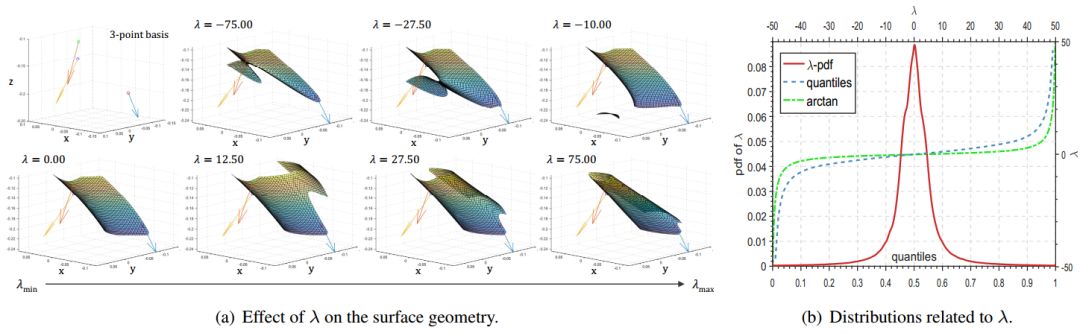 图4:λ的特性,(a)我们计算了固定基的零空间分解,并将λ从-75变到75,从而在解空间中沿直线生成不同的解q。图中显示了由λ控制的表面的转变。(b)求解空间系数和我们的量化函数的统计分布:收集的数据中的λ的概率密度函数PDF(红色曲线)和反向CDF(蓝色曲线)以及tan^(-1)函数(绿线)。请注意,我们的量化函数也很好地符合实践。更小的