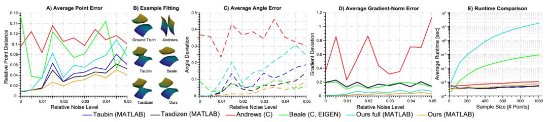 图5:综合评价:(A,C)不同二次曲面拟合方法的平均几何点(A)和角度(C)误差。每点误差测量为每个gnd的平均点到网格距离,拟合二次曲面的真值顶点。角度误差(虚线)被计算为二次梯度与gnd真值法线之间的负点积。(B)给出了示例性的拟合结果,而(D)显示出了与地面实况相比的梯度范数的平均误差。(E)为绘制合成数据的速度和检测率。