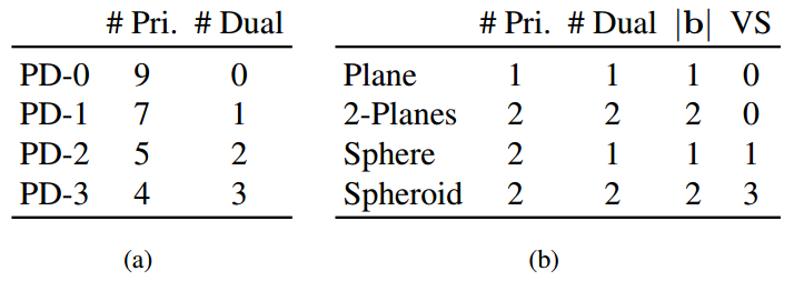 图2:(a)在原始空间(P)和对偶空间(D)中的最小拟合约束数,PD=i是指第i个组合。(b)各种二次曲面的最小约束数和投票空间大小。