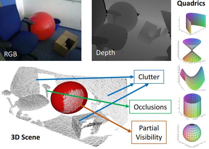 图1:我们的算法可快速检测遮挡,局部可视和杂波条件下点云的二次曲面。请注意,该算法不知道球体是否存在,并且能够仅使用3D几何体来检测合理的基元。
