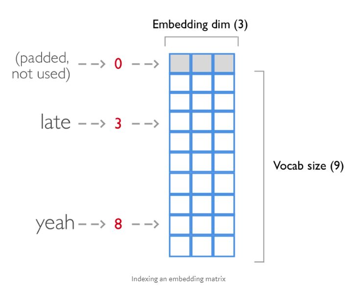 当我们将每个句子输入到嵌入层(Embedding Layer)的时候,每个单词(word)将会映射(mapping)到一个索引(index),所以我们需要将他们转换成整数列表(list)。