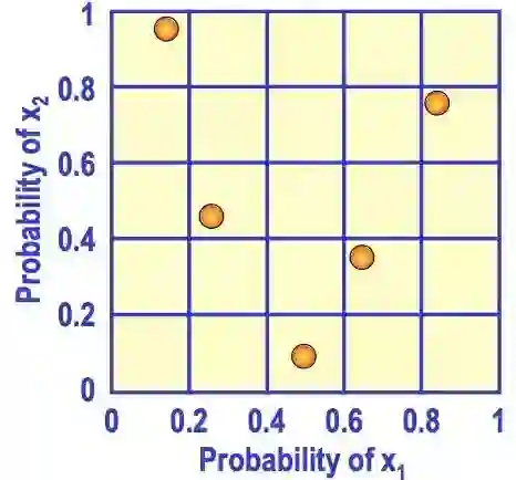 推到高维也是类似的情况。如下图是二维的情形,x1和x2取值都在0到1之间,用拉丁超立方采样来取5个样本点,先将x1和x2分成不同的范围,再取样本点使得每一行中只有一个样本点,每一列中也只有一个样本点。这样能避免多个样本点出现在相近的范围内,使其更加分散。