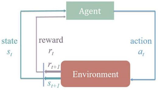 如下图所示,整个过程是在当前状态(st)和环境的反馈(rt)下做动作(at),然后环境会产生下一状态(st+1)和反馈(rt+1),再进行下一个动作(at+1)。