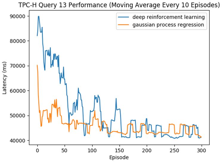 如下图中所示,我们跑了TPC-H基准中的一条查询(Query 13),OtterTune一次次的推荐参数文件直到其达到好的效果(即对应的数据库延迟变低)。