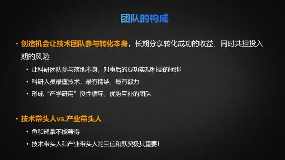 此外要形成产学研用优势互补良性发展的团队,团队中需要有两个人,一个技术带头人,另一个产业带头人,这样的两个人完全互信默契的密切配合,比一个人在所有的场合所有的事情上都要出面,要好的多,而且两个人还能有商有量,相互扶持,相互坚定信心,相互指出可能的风险和问题。