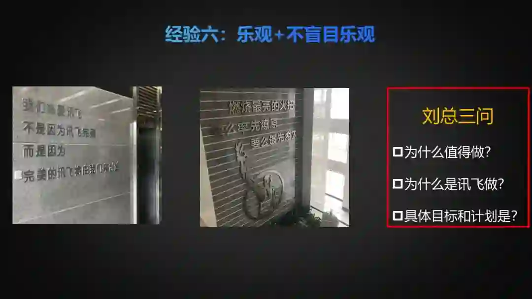 第六条经验是要具备乐观但不盲目乐观的心态。胡国平说,在讯飞外墙上,有两段话,一是“我们热爱讯飞,不是因为讯飞完美,而是因为完美的讯飞将由我们来创造”,这表明讯飞的乐观态度,即使现在还不完美,但是有追求完美的信心;二是“燃烧最亮的火把,要么率先燎原,要么率先熄灭”,这在时刻提醒经营层,在经营公司、经营团队的时候,需要辩证思考,不要盲目乐观、盲目投入。