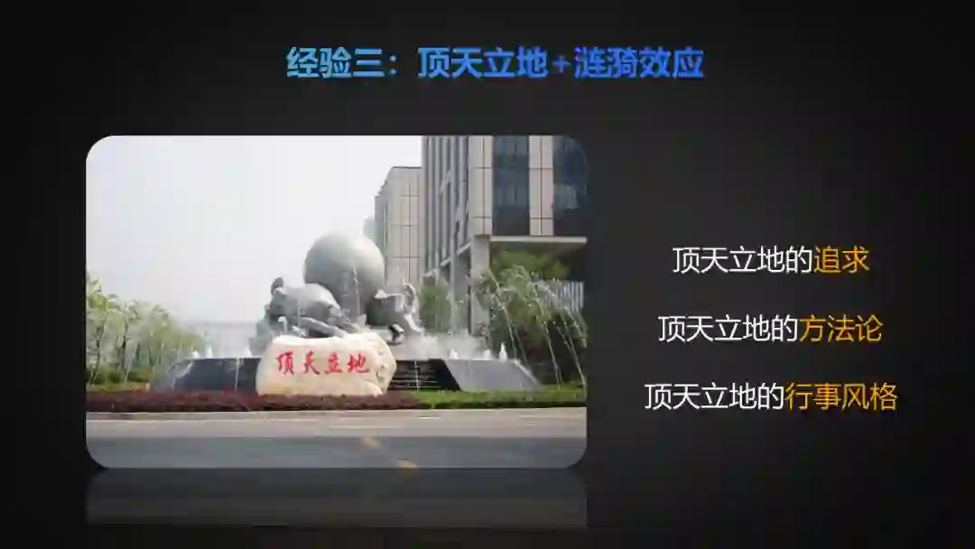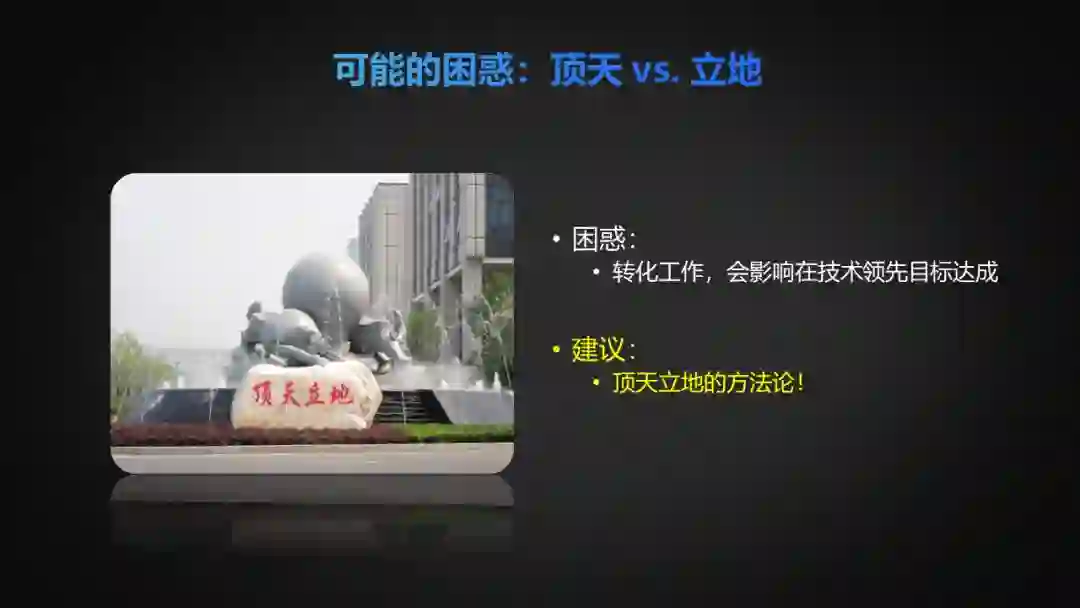 胡国平认为,“顶天立地”是讯飞多年来最重要的经验,它有三层含义。第一层是“顶天立地”的追求,“顶天”就是讯飞的核心技术要国际领先,“立地”就是讯飞的产品要进入亿万家庭,亿万用户;第二层是“顶天立地”的方法论,“顶天”和“立地”不可割裂,“顶天”和“立地”是相互支撑的统一整体:国际领先的技术要能够带来产品和业务上的发展,才是真正的国际领先的核心技术,如果只是一篇论文、一个专利,就算很有学术影响力,也不能说是“顶天”;此外,也要能通过“落地”源源不断地得到数据,帮助核心技术持续保持“顶天”,反过来又推动公司持续保持在“落地”上的强大战斗力;第三层是“顶天立地”的行事风格,要设立“顶天”的目标,然后“立地”或者说脚踏实地的去推进和实践。