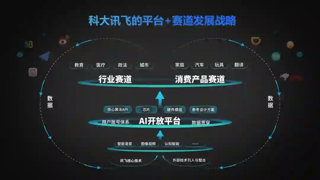 胡国平介绍了科大讯飞的平台+赛道发展战略。科大讯飞通过人工智能开放平台,将自身研发的以及引入和整合的合作伙伴的核心技术,用于已经形成很好市场占有率和市场领先度的行业赛道以及消费产品赛道,包括教育、医疗、政法、城市等诸多行业,以及汽车、玩具、翻译等各类领域,使更多的技术更快速地投放市场。