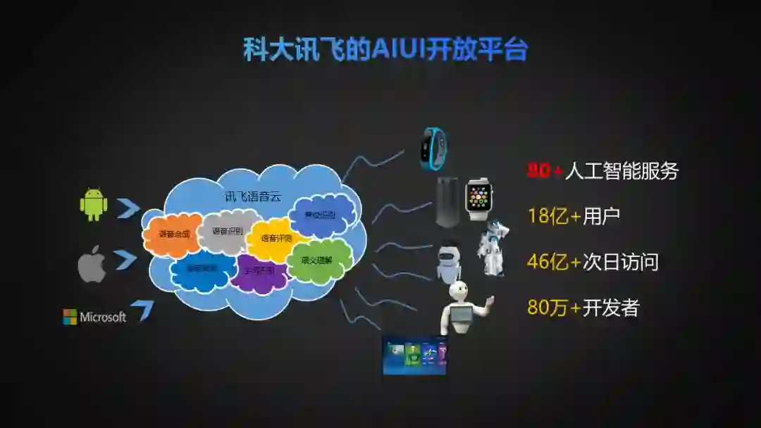 目前科大讯飞的智能语音和人工智能开放云平台已经有18亿用户,每天超过46亿次访问,聚集了80万开发团队。平台上有科大讯飞自己的也有集成第三方的80多个技术引擎。讯飞欢迎更多的第三方能把技术放到云平台上,为中科院等科研院所的人工智能核心技术提供应用落地的出口,形成商业价值,同时把相应过程中所获得的数据脱敏之后还给技术引擎的提供者实现技术迭代升级。