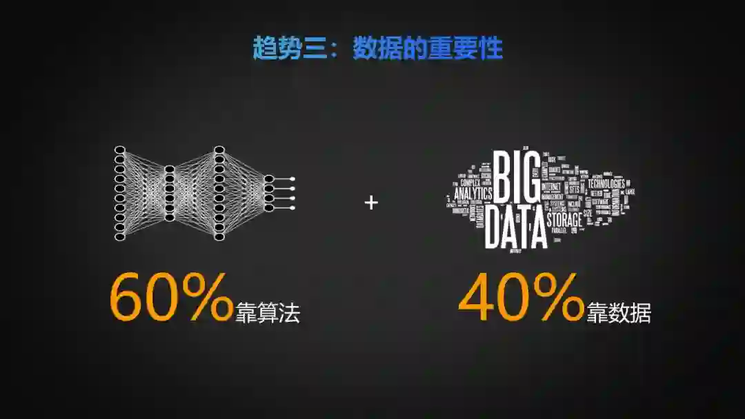 第三个趋势是数据日趋重要。胡国平说,“科大讯飞语音识别从85%飙升到98%这样一个识别率的背后,我们大概测算一下60%靠算法,40%靠数据”。如果要做产业、做产学研,不能只关注算法,也要关注数据。
