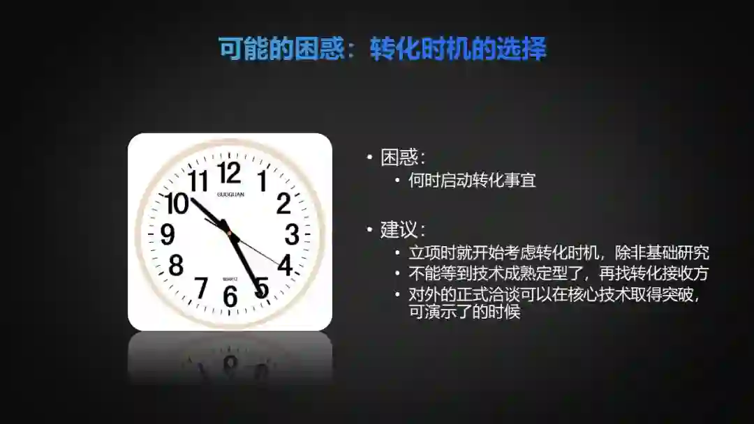 在何时启动技术成果转化方面,胡国平指出在立项的时候就开始考虑转化时机,不要等到技术成熟定型了,再去找转化的接收方。但如果太早了,可能就会流于空谈,浪费时间,所以可以等到核心技术取得突破可以演示的时候,去找转化的时机。