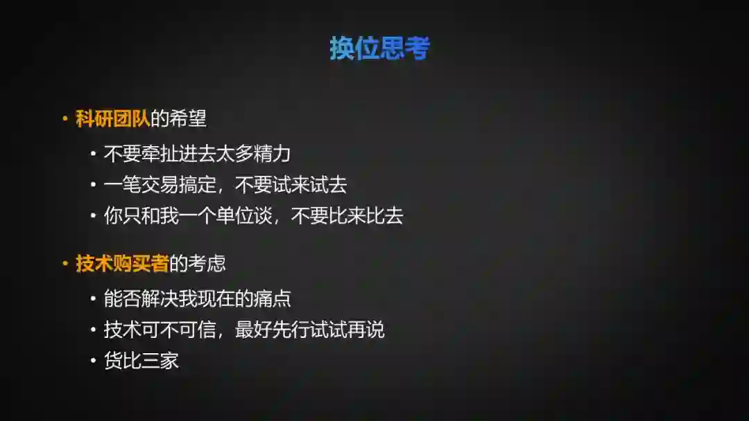 从技术层面来说,还需要一个换位思考。科研人员肯定希望在整个产业化和技术合作过程中不要牵扯太多的精力,最好是一笔交易搞定。但是从技术投资购买者的角度考虑,肯定是希望货比三家。所以科研人员要有耐心,要跟技术购买者去深入沟通。另外如果一个科研团队不是想着把技术简单一卖,而是真的想把技术进行产业化落地,那么一个愿意货比三家,愿意不停地与你讨论技术可行性和技术状态的投资者,对你的团队一定会更有帮助。