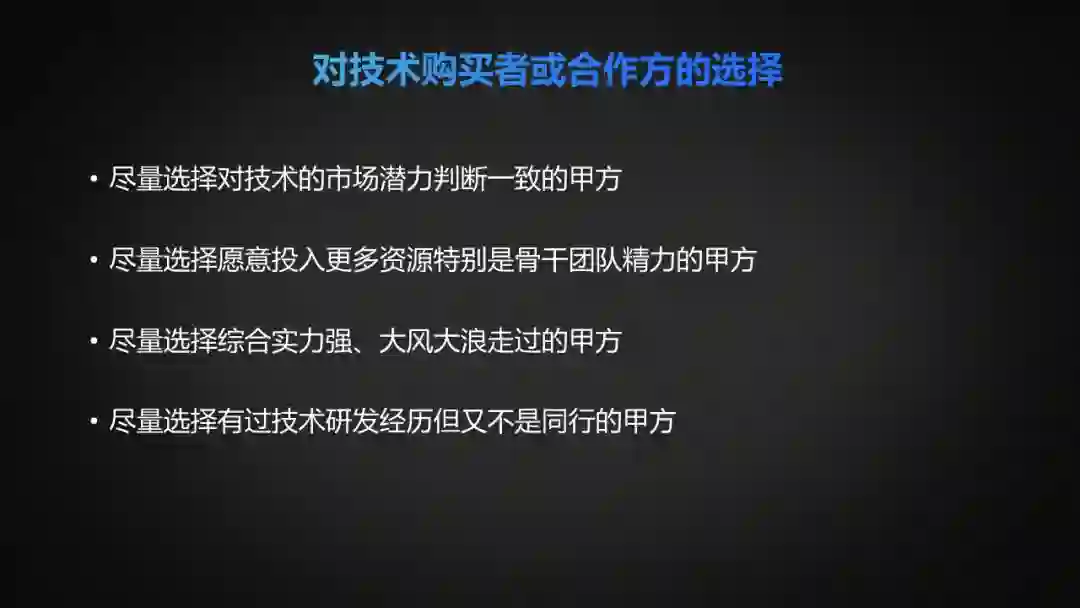 胡国平阐述了创业团队如何选择技术购买者或合作方。一是尽量选择对技术的市场潜力判断一致的甲方。如果甲方本身具备对技术的鉴赏力,有感觉,知道从技术到市场有多远,那么双方合作起来就会很高效。二是尽量选择愿意投入更多资源特别是骨干团队精力的甲方。譬如讯飞投资了小牛翻译,讯飞就愿意和它一起规划和设计发展路线,就像当年联想投资讯飞,它会告诉讯飞该怎么经营、该怎么做技术。三是尽量选择综合实力强、大风大浪走过的甲方。当年科大讯飞曾经奋战四天四夜,就是为了解决提供给华为的语音合成引擎的稳定性问题,测完之后讯飞团队痛下决心要重新写代码。如果有机会跟这样的甲方磨合,会是一个快速提升自身团队能力和技术水平的关键动作。四是尽量选择有过技术研发经历但又不是同行的甲方。选择同行作为甲方,那基本就是一锤子买卖,不用奢望和它长期合作。