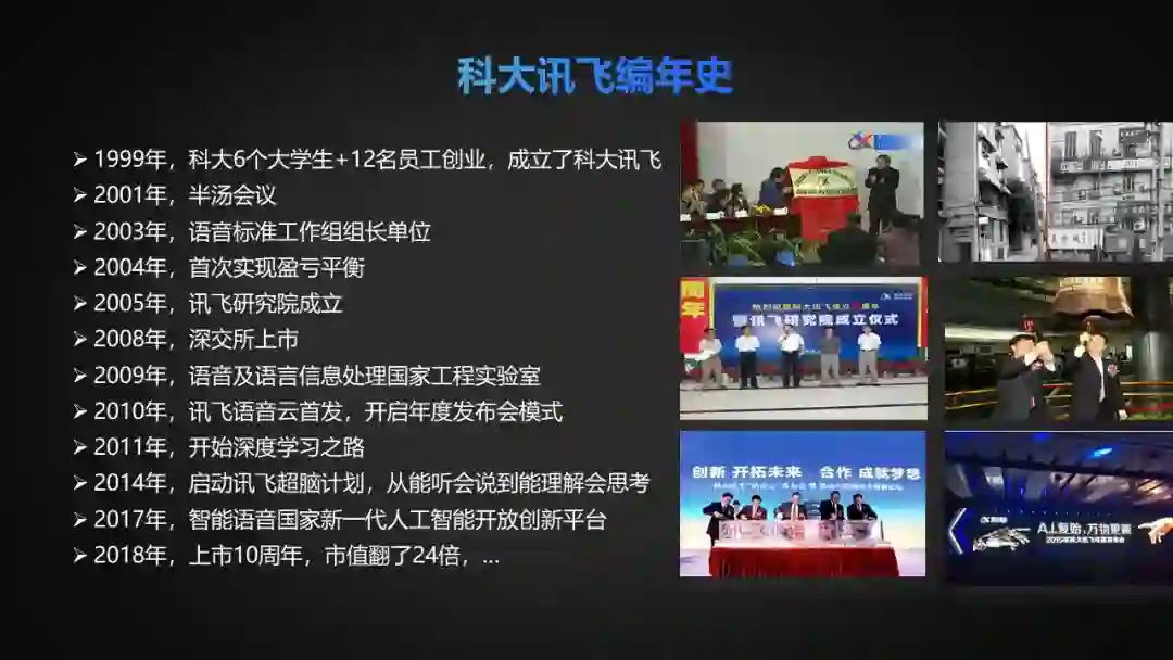 1999年,6个大学生和12个员工,号称“十八罗汉”,一起成立了科大讯飞(胡国平是6个大学生之一)。成立两年后,讯飞的创始团队还没有找到盈利之道,可谓创业维艰。2001年,讯飞团队召开了“半汤会议”,会议结论是,虽然现在还不知道怎么挣钱,但要坚守智能语音研发的路线。这是讯飞历史上的一次关键会议,如果当时的结论是可以放弃现有路线,那么现在的科大讯飞,可能已经成为了一个房地产公司。到2004年,科大讯飞终于实现了盈亏平衡。2005年,讯飞成立了研究院;2008年,科大讯飞上市,这是讯飞发展史上的一个重要里程碑;2009年,获批成立语音及语言信息处理国家工程实验室;2010年,是又一个里程碑节点,讯飞发布了讯飞语音云、讯飞输入法,从一个行业公司转成了一个为大众所知的公司;2011年,在深度学习最开始的时候,讯飞就已经开始投入很多的资源去做深度学习方法;2014年,启动了讯飞超脑计划;2017年,成为智能语音国家新一代人工智能开放创新平台;2018年上市10周年之际,讯飞市值翻了24倍。有人专门统计了在上深交所或者在整个中国股市上市的3000多家企业,连续十年每年增长10%以上的企业,只有十家,科大讯飞是其中之一。