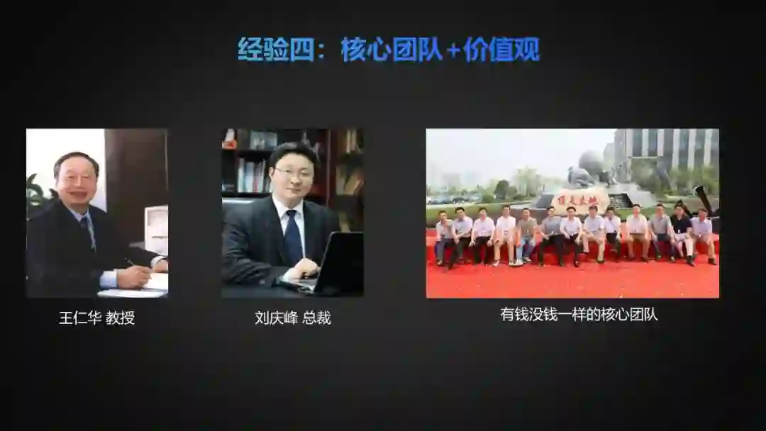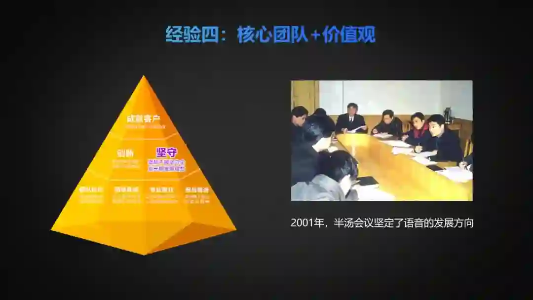 胡国平说,讯飞拥有一支有钱没钱都一样的核心团队。讯飞从1999年创业之初至今,18人的核心团队中只有一位因为身体等特殊原因离开了,正是核心团队的稳定性使得讯飞能够持续向前。此外,讯飞梳理的价值观中,“成就客户”、“创新”等可能与其他公司的类似,但有一个与很多其他公司不一样的价值观,叫做“坚守”,正是半汤会议确定了要坚守语音方向,而不是迫于投资方的压力,转向房地产等领域,才有了今天的讯飞。