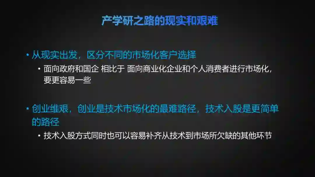 胡国平建议要从现实出发,区分不同的市场化客户选择。to G、to大B,相比to C、to小B会更容易一点。另外,自己拿着技术出来创业,其实是很难的一个事情。建议可考虑以技术入股的方式和大的企业合作,或者和别人共建一个合资公司,这样能最容易补齐从技术到市场的各个缺失环节,使技术能快速的实现应用落地。