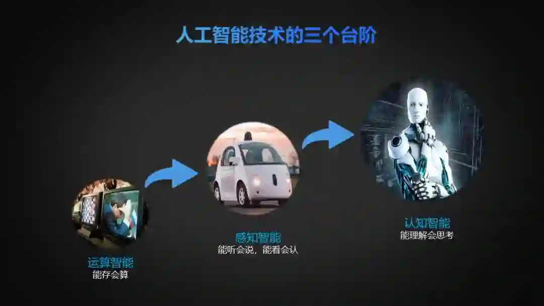 面对当前的人工智能浪潮,胡国平认为我们有必要认清整个产业所处的态势。人工智能智能技术主要有三个不同的台阶,即运算智能、感知智能、认知智能。计算机在运算智能方面已经完全超越了人类,在感知智能上基本可以达到与人类媲美的地步,在认知智能方面与人类相比则还有较大差距。