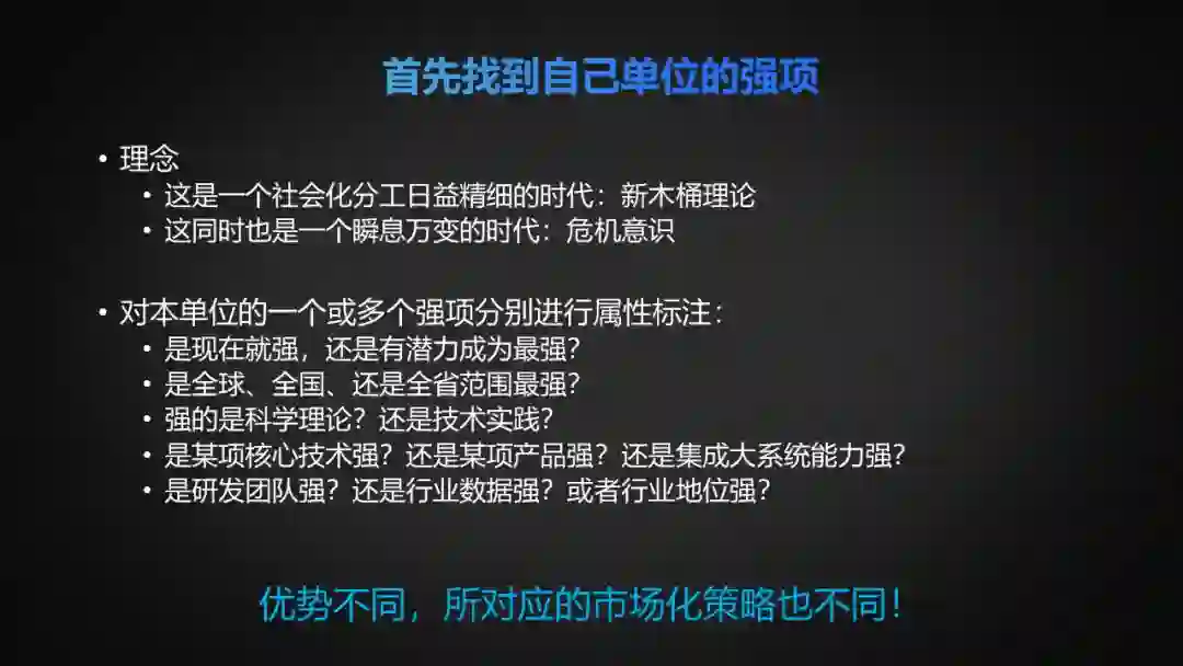 胡国平建议在这个社会化分工日益精细的时代,首先要找到自己单位或团队的强项。新木桶理论指出要把自己的那块板做得越长越好,其它的短板自然会有人来帮你加长。同时在这个瞬息万变充分竞争的时代要具备危机意识,对本单位的强项,一定要进行有效的标注,同时采用有针对性的应对策略。