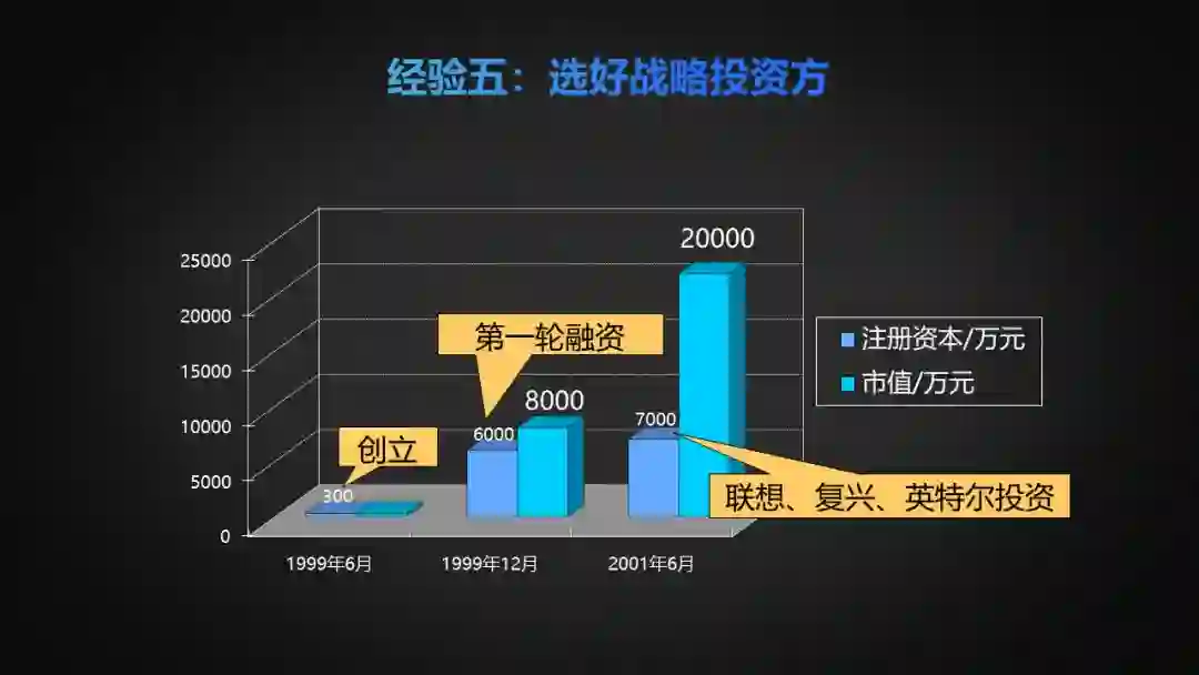 科大讯飞成功的重要经验还包括选好战略投资方。2001年,联想、复兴、英特尔投资了科大讯飞,或者说是科大讯飞基于一些重要考量选择了上述了三家作为投资方。联想对早期的讯飞帮助很大,联想不仅是财务投资,还会利用其丰富的产业化经验和行业影响力,和讯飞共同探讨发展思路,协助讯飞开展经营;复兴多元化以及基于企业发展前景判断的投资理念对讯飞的影响也很大;英特尔的国际化视野也给讯飞的发展带来了很大的启发。所以,在创业之初,选择对企业成长有帮助的投资方,非常重要。