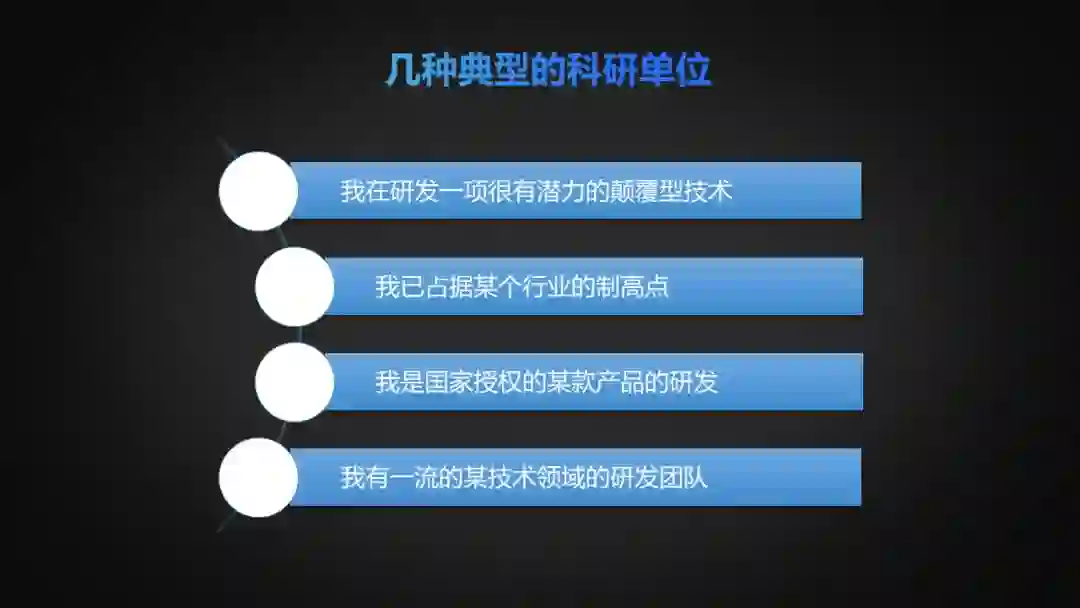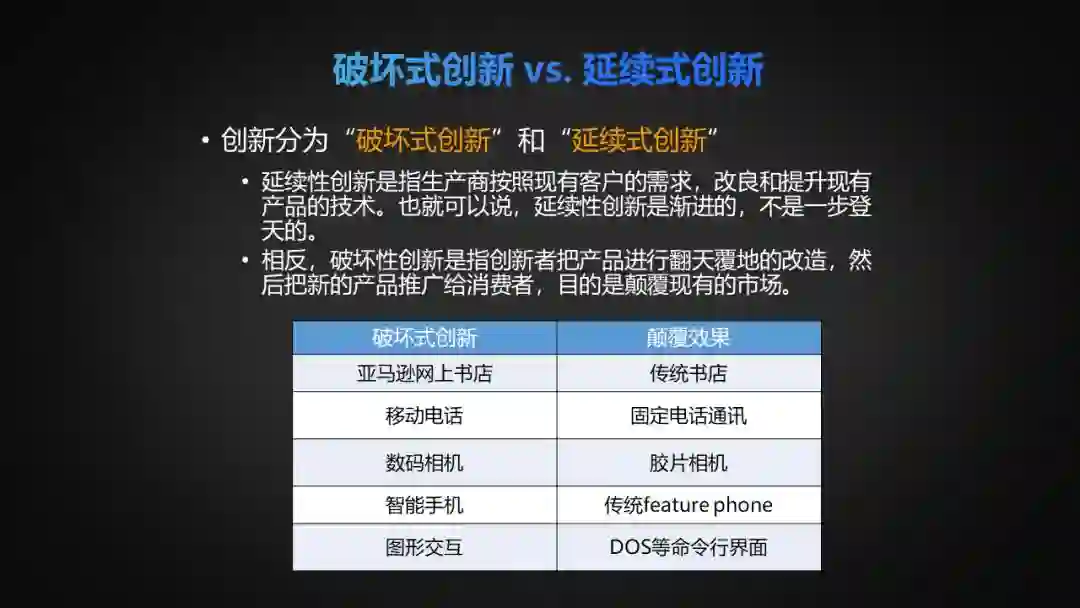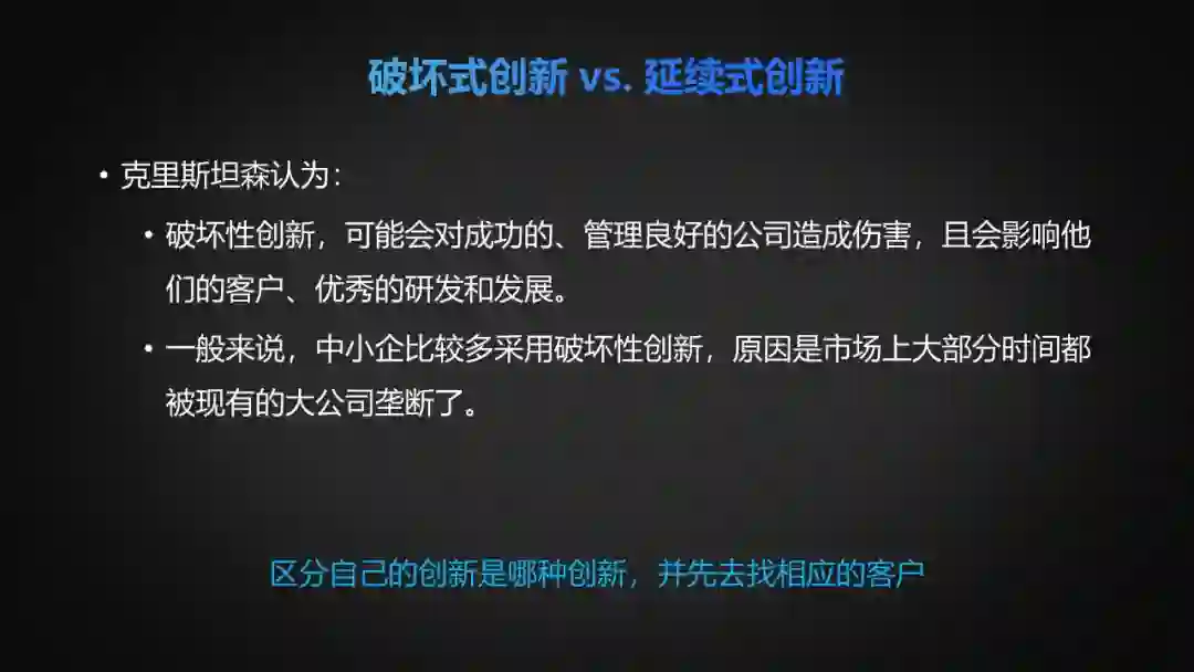 第二是一定要明确自己做的是“破坏性创新(颠覆性创新)”还是“延续性创新”。如果是延续性创新,建议去找现在这个技术领域市场上典型的具备全面优势的企业合作;但如果是破坏性创新,如果要卖给一个相对守旧的没有那么大魄力的成熟公司,可能会抑制技术和商业上的发展,这时可能选择有创新活力的中小企业或团队合作会更好。