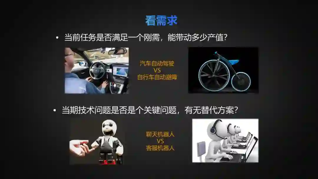 看需求,就是当前任务是否满足刚需,能带动多少产值,可以理解为这个事情值不值得做。比如对汽车自动驾驶的需求显然比对自行车自动避障的需求大,或者说市场空间会更大,所以自动驾驶会很多人投资,但自行车自动避障技术可能就是做一个秀,不会有太多的价值。此外,评估当前技术问题是不是一个关键问题,有无替代方案,也至关重要。做技术的可能会觉得自己的技术就是无所不能,不可替代,但很可能并不是。譬如聊天机器人,虽然当前在商业上是否成功还没有定论,某些聊天机器人也很火,但是它和客服机器人不一样,客户机器人没有什么替代方案。如果一个人真的愿意聊天,他完全可以找很多人聊天,可以解决聊天的需求,所以聊天机器人是有替代方案的。