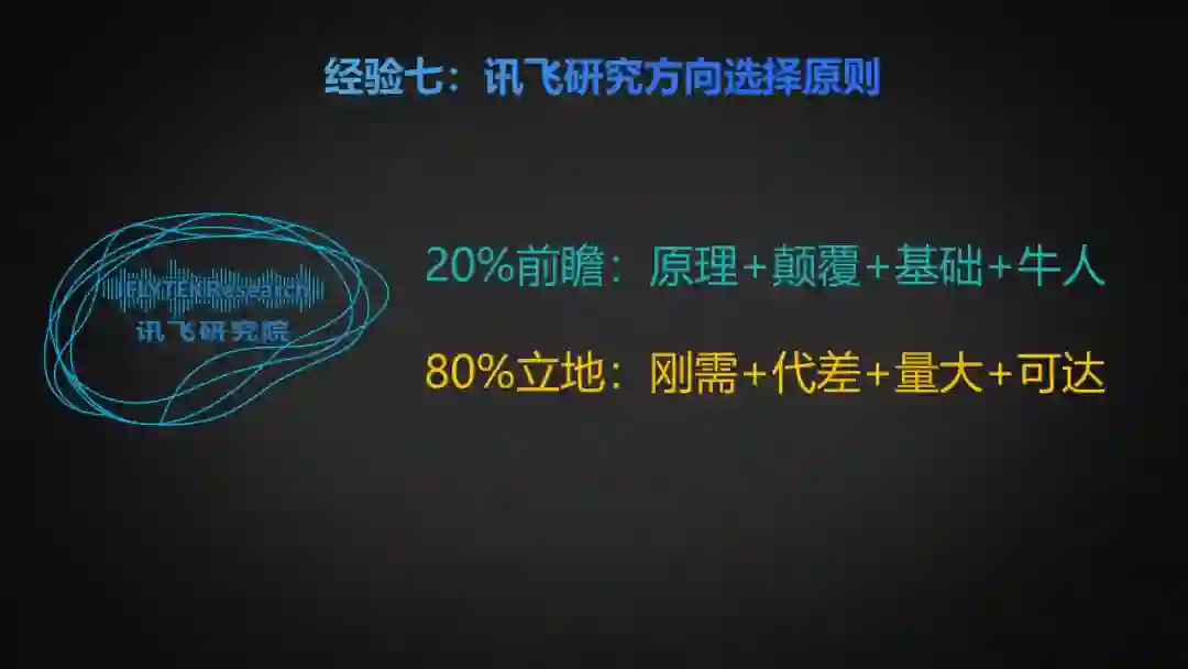 胡国平介绍了讯飞在研究方向上的选择原则。讯飞研究院将20%的投入用于前瞻研究,80%投入要“立地”,要产生效益。讯飞非常强调前瞻,但不是任意的盲目的前瞻,要具有颠覆效应,同时做前瞻研究必须要引入牛人。在“立地”的研究上,要用好八字诀“刚需、代差、量大、可达”,要有真实需求、量大面广的基础,和别人相比能做出技术代差,以及一定要评估技术能在何时达到一个可用的水平。