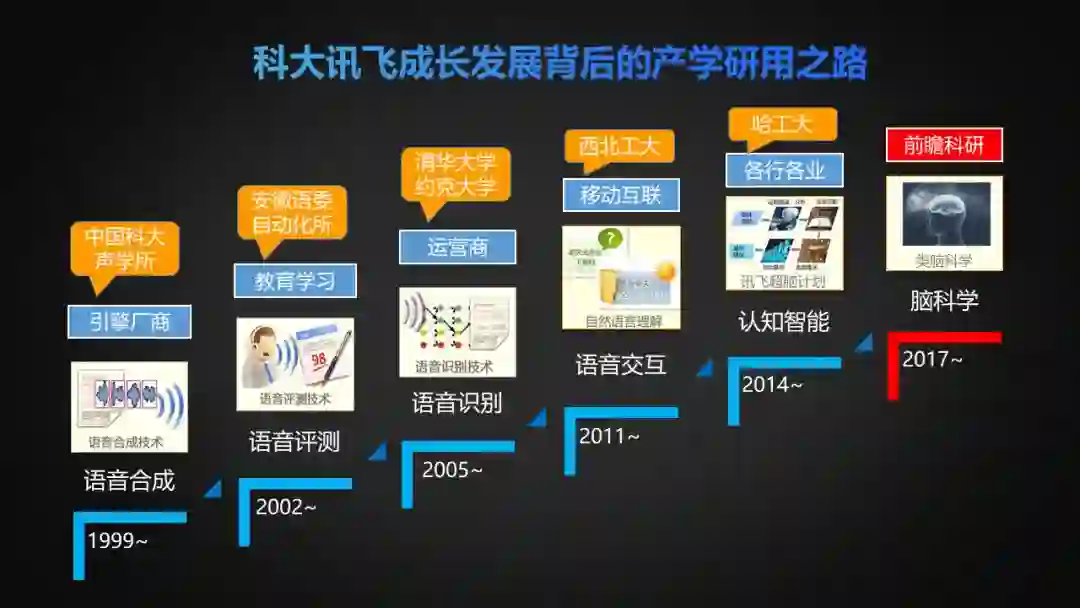 科大讯飞一直是一个技术支撑型的公司,从创始至今经过了6个主要的技术台阶。1999年讯飞做语音合成让计算机去开口说话;2002年开始做语音评测,就是评价一个人的普通话水平,进入了教育领域;2005年,做语音识别,要做到让机器人说话,更要能听懂人说话,从而进入了电信运营等行业领域;2011年开始启动一个新的方向语音云交互,紧随了移动互联网时代发展;2014年,启动了讯飞超脑,进军认知智能领域,就是让计算机能理解会思考,掌握知识学习和推理能力。认知智能的研究推动了讯飞进入了各行各业,包括最近两三年开始做的医疗、司法等行业。