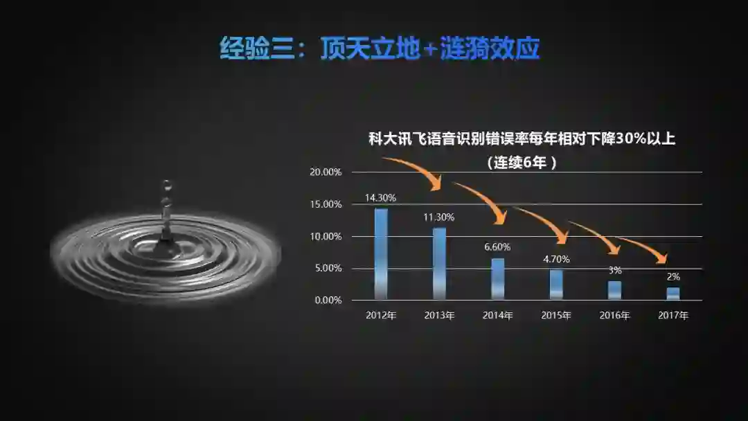 目前讯飞设定的目标“让机器能理解会思考”、“用人工智能建设美好世界”,到目前来说并没有真正的实现。但是讯飞在一步一步的努力实践,利用“涟漪效应”推动技术进步。一个石头投入一个平静的水面产生的水波纹往外扩散,水波纹的高度会越来越低,类似的,新的技术投入市场,随着不断迭代,技术的错误也会越来越小,总有一天,会实现“顶天”的目标。举例而言,用户在讯飞输入法上能感受到的语音识别技术,从2012年到2017年,错误率每年下降30%左右,使用错误率从14.3%一路下降到2%,或者说正确率从85%一路飙升到98%。因此,当技术还不够成熟的时候,就需要将某些人工智能技术、产品或系统,先推出去,再通过持续的数据积累,获得技术迭代进步。