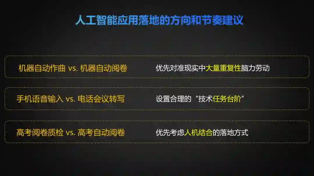 胡国平建议在把控人工智能应用落地的方向和节奏时,要优先对准现实中大量重复性脑力劳动,设置合理的“技术任务台阶”,可以志向高远,但是台阶得一个一个的爬,以及优先考虑人机结合的落地方式,不要一上来就要全自动,全部由机器来做。