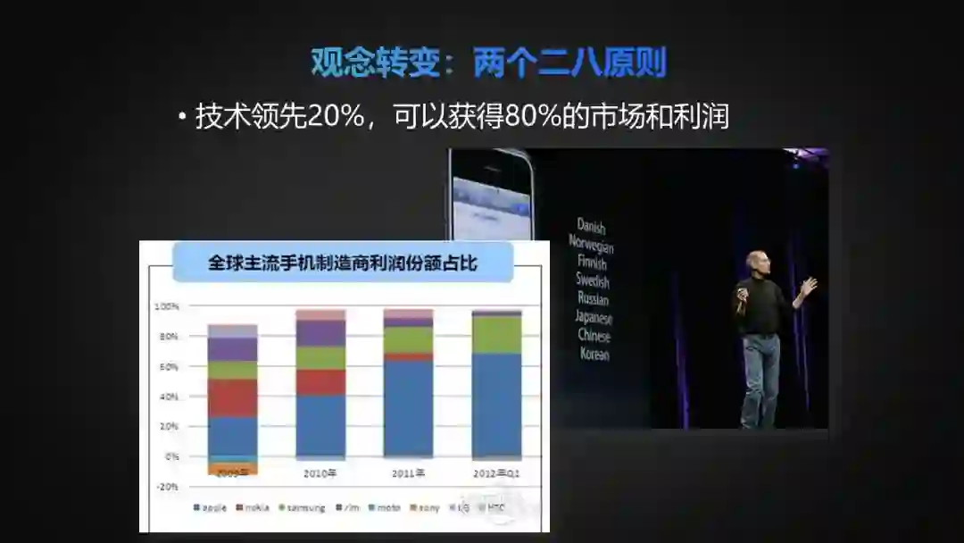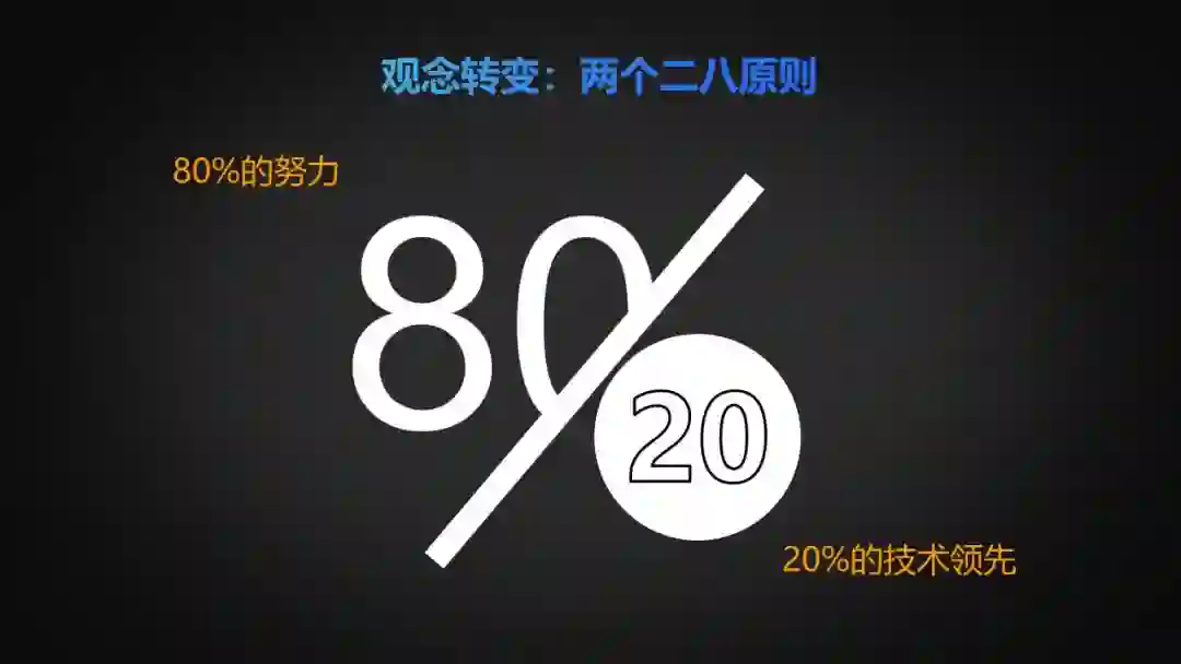 对于创业团队而言,需要转变两个观念。第一个是“二八原则”。“二八原则”有着硬币的正反两面,“80%的努力可能只能获得20%的技术提升,但如果你的技术能领先20%,你就有可能获得80%的市场份额和利润”,胡国平说,“这意味着要坚定技术投入并保持领先的决心”。譬如苹果手机可能都没有比安卓手机好20%,但是它的利润大概占据了整个市场利润的80%。所以一分钱一分货,一分努力一分收获,还是要坚定在技术上追求完美,往世界领先的方向努力。
