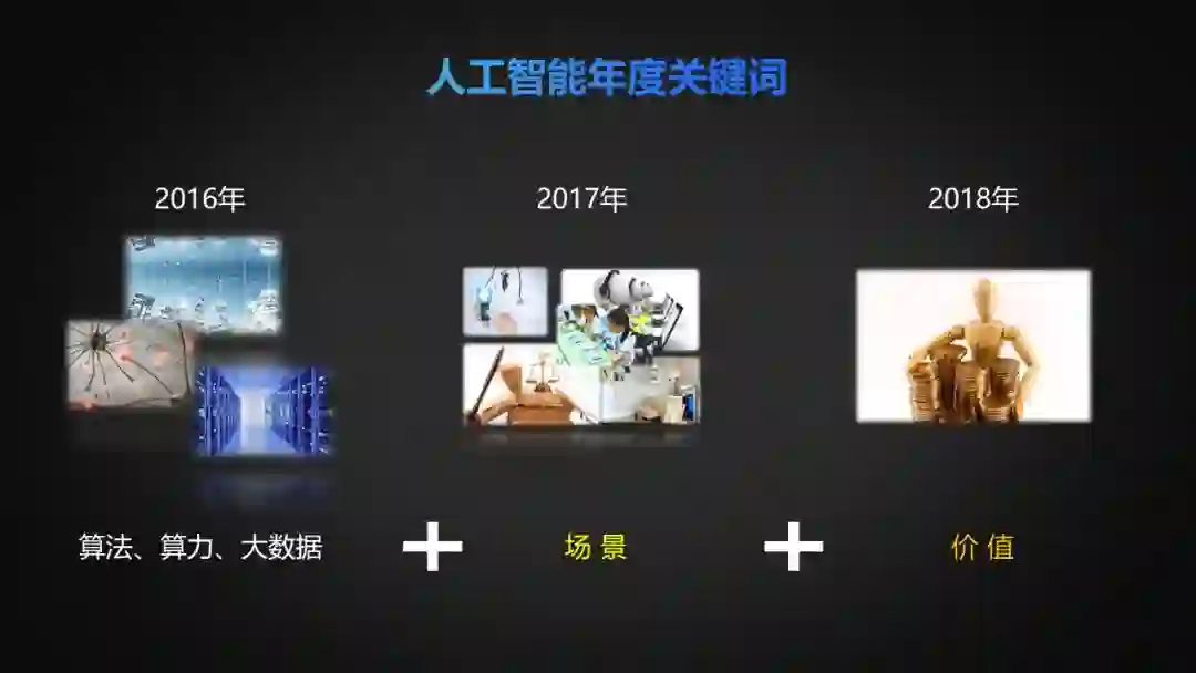 2016年人工智能60周年刚热的时候,有三个关键词: 算法,算例和大数据;到2017年,很多人想,有了这些技术,接下来做什么?有了这个锤子,就要去敲钉子,于是场景就成为2017年的关键词。到2018年,大家更强调的则是价值。我们要选择一个有价值的场景,然后堆积相关的算法、算例和大数据来支撑,这成为现在的人工智能产学研和人工智能创业的一个关键的方法论。