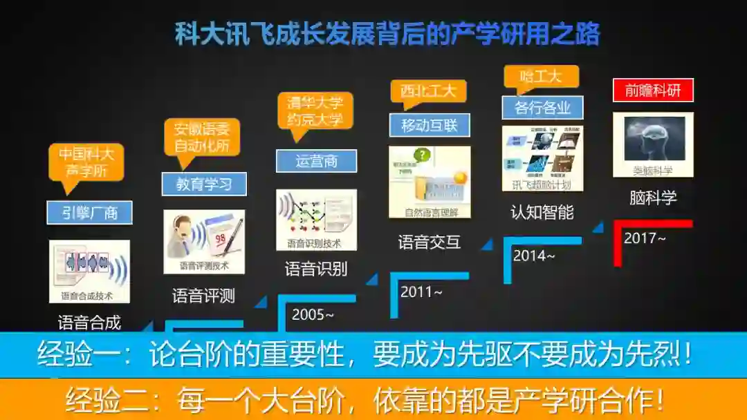 科大讯飞的第二条经验是每上一个大的台阶,依靠的都是产学研合作。在做语音合成引擎时,科大讯飞和中国科大以及声学所达成了很好的合作,做到了技术上领先,应用上落地。在研究语音评测技术时,与安徽语委和自动化所进行了深入合作。在做语音识别时,和清华大学以及加拿大约克大学成立了联合实验室。在认识智能方面,与刘挺教授的团队建立了哈工大讯飞联合实验室。在最新的脑科学研究领域,包括类脑计算、脑保护等方面,讯飞也在与同济大学、中科院心理所等寻求合作。从讯飞的经验来看,一个公司要在技术方面保持持续引领,在合适的时候找到合适的技术研发团队一起合作,去攀登下一个台阶,是非常重要的战略。