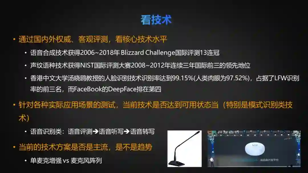 第二个是看技术,就是看技术值不值得投资。首先作为相对规模较小的技术团队而言,要通过国内外权威客观的评测来证明自己的核心技术实力。以讯飞为例,从2006年到2018年,语音合成技术获得国际评测13连冠,就说明讯飞的语音合成技术绝对是全球领先。虽然参赛的最新合成技术未必能直接用于现有产品,但能表明团队保持持续国际领先的技术实力和潜力。包括商汤的图像识别技术当年号称首次突破了人类肉眼的水平,也是同理,是它当下大热的重要原因之一。另外很多科研团队都会参加一些国际比赛,这时要特别强调参赛的其他团队是谁,如果是一些不入流的大家都没听说过的,那也无法彰显自身的实力。