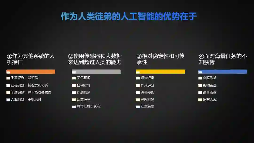 胡国平提出相比于人类智能,人工智能的优势有四点。一是可以作为其他系统的人机接口,像停车场的车牌识别,可以用于收费管理,我们可以在很多场景下找到类似的必要的或者非常方便的接口,成为人工智能技术落地的很重要的应用;二是使用传感器和大数据来达到超过人类的能力,比如天气预报就是典型,现在天气预报会告诉你哪个小时会下雨,那就是因为它有足够的传感器,足够的计算能力,又比如自动驾驶可以用毫米波探测器、夜视仪等形成一系列人类所不具备的能力,因此未来能比人做得更好;三是相对稳定性和可传承性,人与人之间存在着不一致性,有很多主观性,譬如不同的普通话评测员,对同一个考生,评分可能不一致,会需要仲裁,而机器则更加客观,更加稳定,更加一致,使得它最终能够超过人工;四是面对海量任务可以做到不知疲倦,不管多大的任务量过来,都会忠实地把它完成。